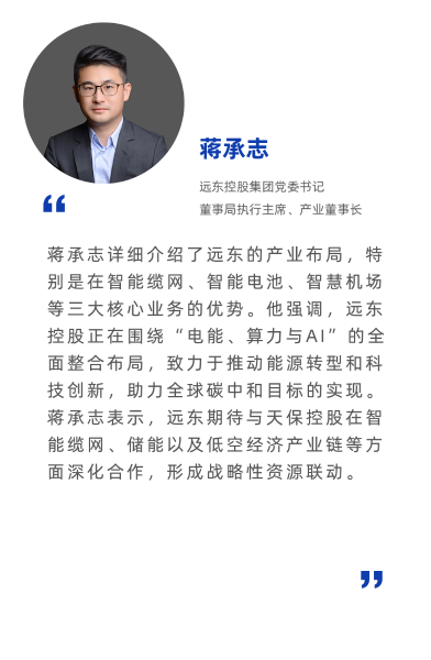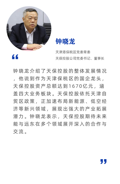 2025年11月6日,天津港保稅區(qū)黨委常委,天??毓晒军h委書記、董事長鐘曉龍率隊到訪遠東。遠東控股集團黨委書記、董事局執(zhí)行主席、產(chǎn)業(yè)董事長蔣承志熱情接待并座談。